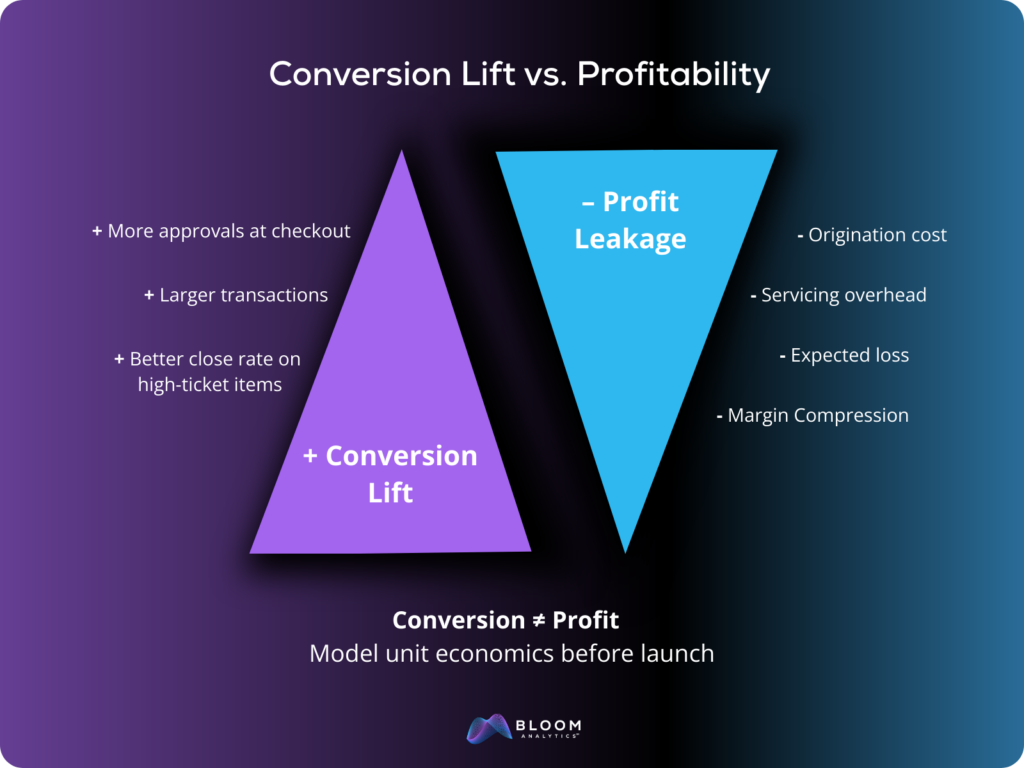 If offering financing increases conversion by 20 percent, that sounds great. But now ask:
